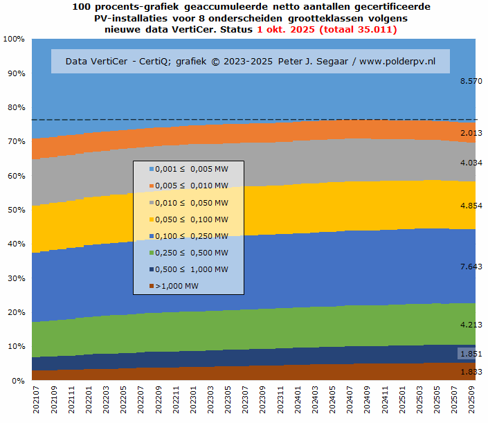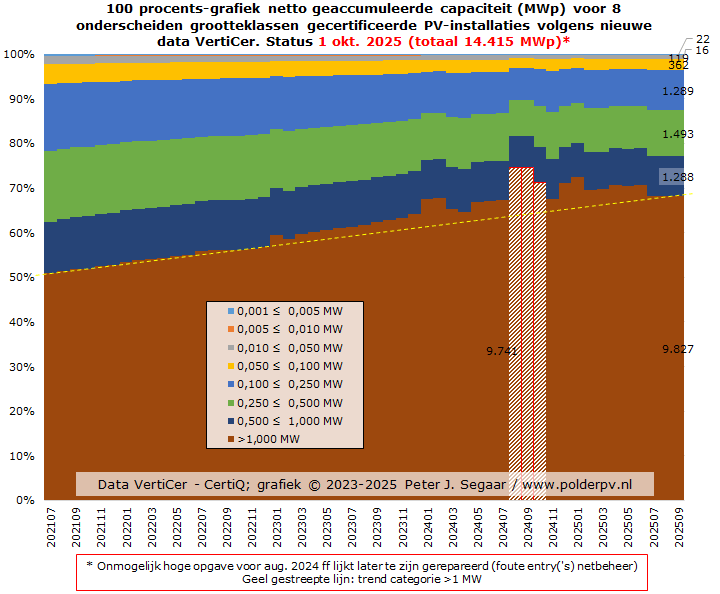 De geaccumuleerde gecertificeerde zonnestroom capaciteit in de database van VertiCer ligt, bijvoorbeeld, voor eind september 2025, flink lager dan voor het momenteel nog veel te hoge niveau voor eind 2024 / begin 2025, op ruim 14,4 GWp, en is daarmee nog steeds iets lager dan de huidig bekende accumulatie voor eind juli 2024, ruim een jaar eerder (!). De grootste project categorie (>1 MWp) zou een geaccumuleerd volume hebben bereikt van ruim 9,8 GWp, wat, by far, het grootste volume van alle grootte categorieën is, en ook zal blijven. De in een vorige update gemelde record capaciteits-toevoeging in het tweede kwartaal van 2024 is inmiddels 981 MWp geworden (pending latere updates).