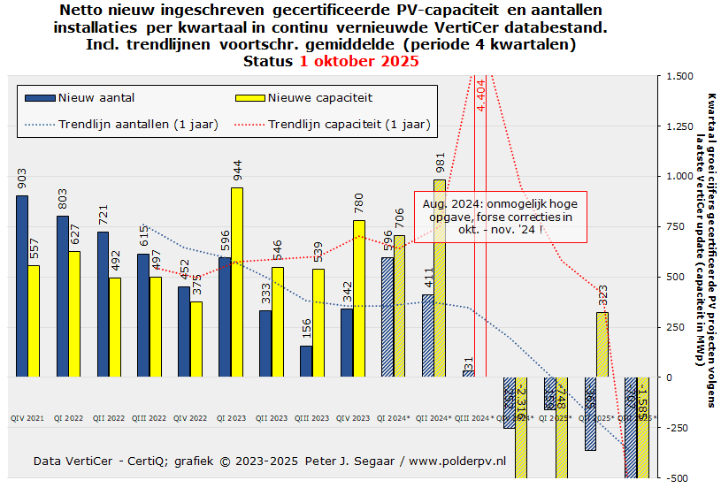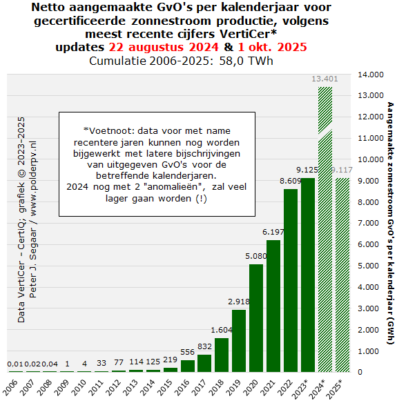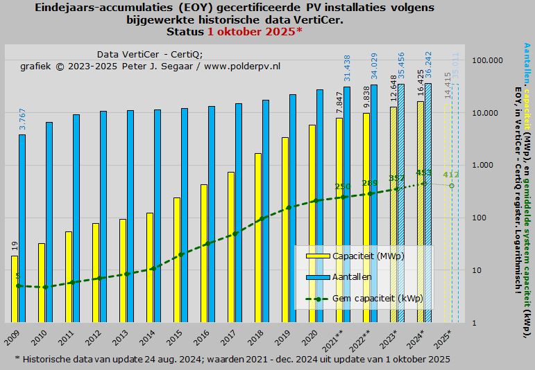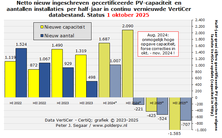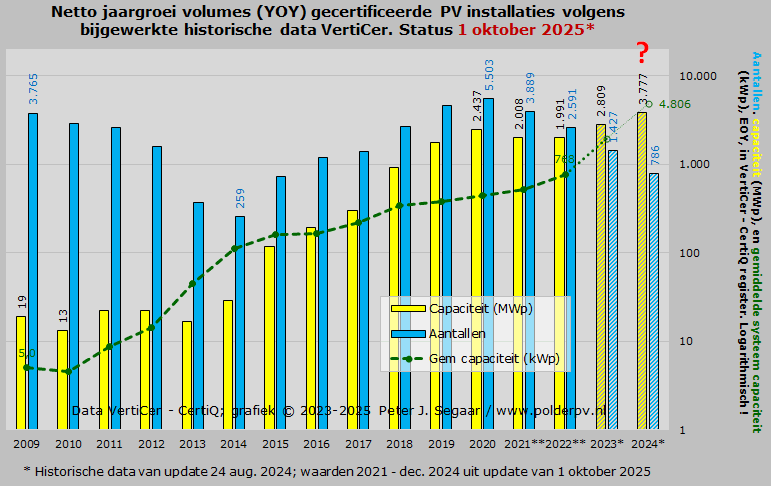 In de huidige rapportage brengt Polder PV de nieuwe resultaten uit de data rapportage van VertiCer, voor september 2025, waarbij de jaargroei cijfers in de jaren 2022 en 2023 (vrijwel) zijn gestabiliseerd. Met de huidige, verder opwaarts bijgestelde cijfers voor 2024 zou dat jaar een nieuw record niveau van inmiddels bijna 3,8 GWp groei hebben bereikt, ruim een derde hoger dan in 2023. Dit blijft, ook gezien andere gepubliceerde marktcijfers schier onmogelijk, en zal in een later stadium zeer waarschijnlijk later fors neerwaarts (moeten) worden bijgesteld. Het is mogelijk dat deze "onmogelijke groei" ook de nationale CBS cijfers heeft beïnvloed, die veel te hoog zijn voor 2024.