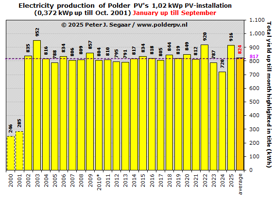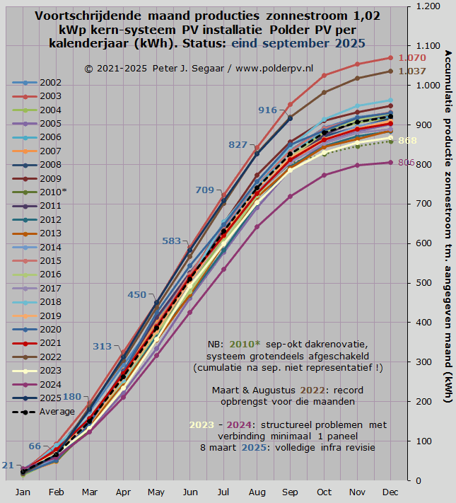 Februari tot en met april 2025 deden het marginaal beter, met 16.225, 17.235, resp. 17.329 nieuwe installaties, met een gezamenlijke AC capaciteit van 84,8, 92,1, resp. 91,9 MWac. Resulterend in gemiddeld vermogens van 5,22, 5,35, resp. 5,30 kWac per nieuwe installatie. In mei werd een nieuw dieptepunt bereikt, met nog maar 12.565 nieuwe registraties, resp. 67,2 MWac, en een gemiddeld vermogen van 5,35 kWac. De daarop volgende vakantie maanden juni tm. augustus voegden 88,2, 78,9, resp. een nieuw dieptepunt, 59,7 MWac toe, en 14.280, 13.565, resp., wederom het laagste niveau, 10.109 nieuwe registraties. Het gemiddelde per nieuwe registratie, opvallend hoog in juni (6,18 kWac), viel in juli tm. september weer terug naar 5,82, resp. 5,91 en 5,85 kWac per nieuwe registratie. Het niveau lag in september 2025, wat de aantallen registraties betreft, op een zwaar tegenvallende 41% t.o.v. de hoeveelheid in september 2024, wat zelf al 62% minder was dan het nieuwe volume in september van het recordjaar 2023.