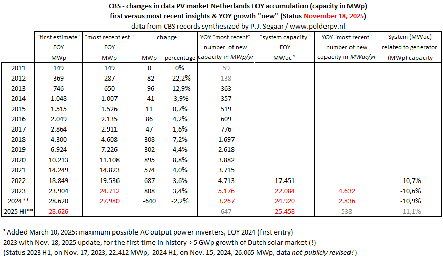 Voor de jaren 2023 en 2024 zijn tevens de geschatte AC vermogens inmiddels gewijzigd. Bovendien zijn nu de aller-eerste data voor medio 2025 (eind 2e kwartaal) bekend gemaakt. Er zouden eind juni 2025 3,24 miljoen PV installaties zijn geaccumuleerd, met een gezamenlijk vermogen van 28.626 MWp. Dat is slechts 647 MWp meer dan eind 2024, wat beslist een forse verdere markt-afkoeling weergeeft. Maar niet vergeten moet worden dat dit soort eerste cijfers later zeer fors worden bijgesteld in volgende CBS updates, zoals de flink fluctuerende cijfers voor 2024 alweer hebben laten zien.