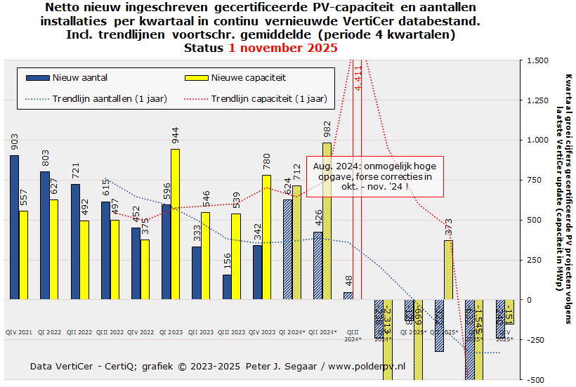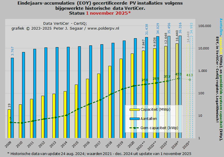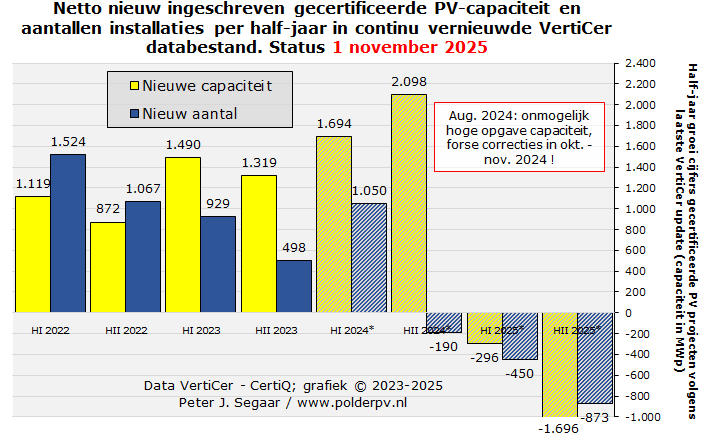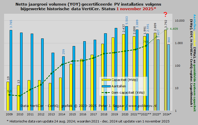In de huidige rapportage brengt Polder PV de nieuwe resultaten uit de data rapportage van VertiCer, voor oktober 2025, waarbij de jaargroei cijfers in de jaren 2021 tm. 2023 zijn gestabiliseerd. Met de huidige, verder opwaarts bijgestelde cijfers voor 2024 zou dat jaar een nieuw record niveau van inmiddels bijna 3,8 GWp groei hebben bereikt, ruim een derde hoger dan in 2023. Dit blijft, ook gezien andere gepubliceerde marktcijfers schier onmogelijk, en zal in een later stadium zeer waarschijnlijk later fors neerwaarts (moeten) worden bijgesteld. Het is mogelijk dat deze "onmogelijke groei" ook de nationale CBS cijfers heeft beïnvloed, die veel te hoog zijn voor 2024.