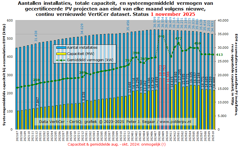 In deze grafiek, met de meest recente actuele en gewijzigde data uit de oktober 2025 rapportage van VertiCer, en deels oudere data uit de CertiQ updates, de stand van zaken vanaf juli 2021 tm. oktober 2025. De blauwe kolommen geven de ontwikkeling van de aantallen installaties weer (ref.: rechter Y-as), voorlopig culminerend in 34.993 exemplaren, begin november 2025. Wat, wederom, een netto negatieve groei weergeeft van 240 projecten** t.o.v. de status, eind september 2025 (gereviseerd, 35.233 exemplaren), en wat zelfs al 1.596 exemplaren (4,4%) minder is dan het tot nog toe hoogste niveau (36.589 in, inmiddels, juli 2024, gereviseerd).