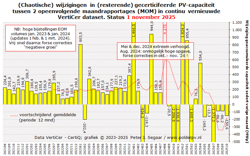 Terugkerend in de analyses van Polder PV blijft de observatie dat er regelmatig "onwaarschijnlijke", dan wel "inconsistente" cijfers in de actuele data van VertiCer zijn terug te vinden. Dit is deels het gevolg van het feit dat het bij maandelijkse verschillen altijd om netto effecten van zowel instroom als uitstroom van projecten gaat, een toenemend aantal uitschrijvingen van meestal kleinere installaties actueel is, en, tegelijkertijd, steeds groter wordende nieuwe projecten bij de inschrijvingen. Daarnaast kunnen, vanwege wel toegezegde, maar nog steeds ontbrekende uitgangs- en ingangs-controles, al meermalen door Polder PV aangetoonde foute data entries van netbeheerders, ongecorrigeerd in de databank belanden, die pas na een lange periode zouden (kunnen) worden hersteld, etc. Het maakt het er allemaal niet overzichtelijk op. En leidt regelmatig tot zeer verwarrende cijfers.