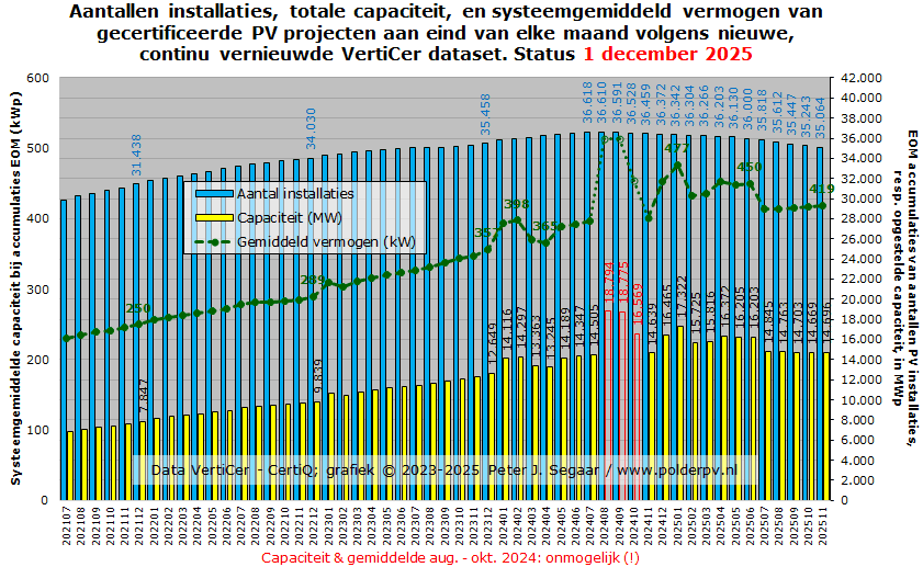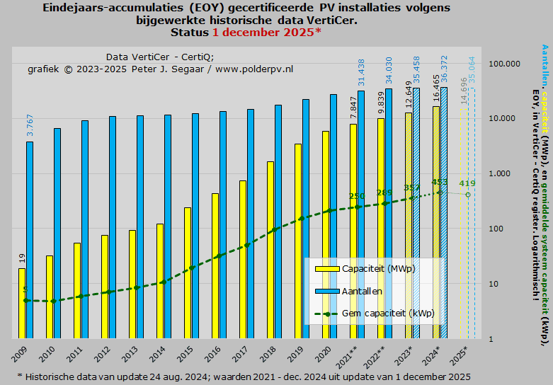 Wat de kwartaal producties betreft, zijn eerder al, door diverse wijzigingen, wat zaken veranderd. Tot en met eind 2024 is inmiddels het tweede kwartaal van dat jaar recordhouder, met een berekende productie van 8.658 GWh (aangepaste cijfers). Dit is een factor 4,3 maal zo veel productie dan in het laatste kwartaal (1.998 GWh), wat logisch is, omdat daar 2 winterse maanden met korte dagen in zitten. QII 2024 had tot nog toe 1,6% meer berekende productie dan het tweede kwartaal van 2023 (8.520 GWh), maar dat had dan ook de record opbrengst in juni bij dat al hoge resultaat zitten. Het derde kwartaal van 2024 deed het zelfs 18% beter dan QIII in het voorgaande jaar, voor het vierde kwartaal was het verschil ruim 16% (vergeleken met QIV 2023).