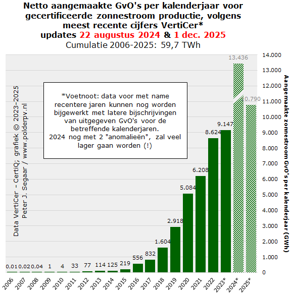 *** Gedetailleerder, volgens de huidige CBS tabel, zou er in het eerste half-jaar van 2024 8.658 GWh zonnestroom productie zijn berekend, in de eerste 6 maanden van 2025 was dat tot nog toe 9.706 GWh