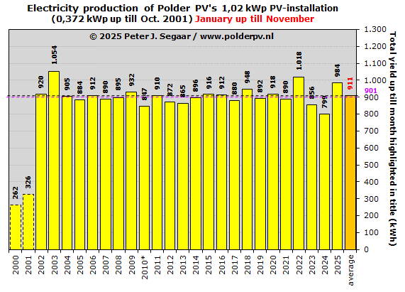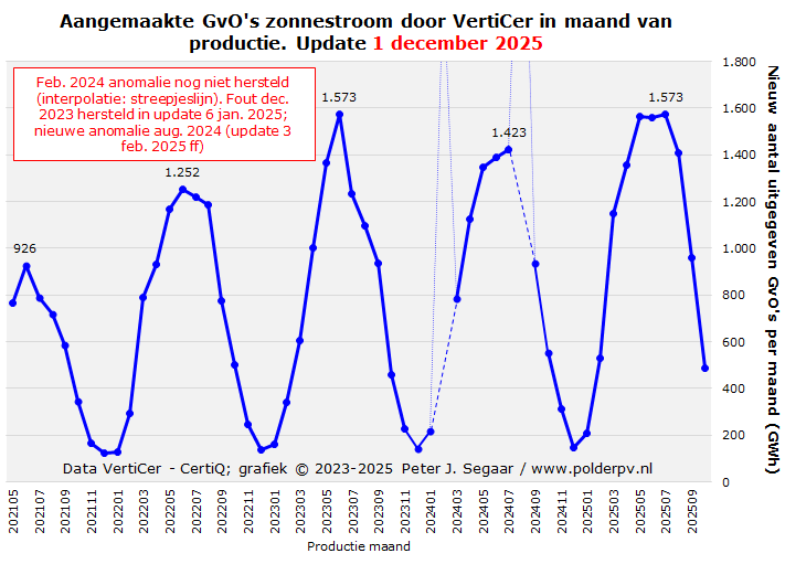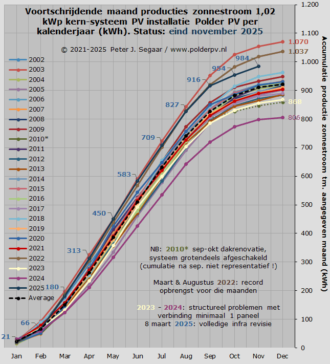 Het gemiddelde voor 2025 is nog niet bepaalbaar, omdat er nog een viertal maandproducties aan ontbreken (bovendien grotendeels in het winterseizoen, dus het lopende gemiddelde, inmiddels 2.445 GWh/maand, ligt nu nog veel te hoog).