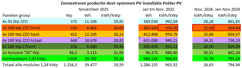 Rechts van de zwarte balk zijn de verschillen in de afzonderlijke maandproducties tussen, achtereenvolgens 2019-2020, 2020-2021, 2021-2022, 2022-2023, 2023-2024 en 2024-2025 (voor de bekende maanden) weergegeven. Met telkens in de linker kolom het absolute verschil in berekende productie, en rechts ernaast, het relatieve verschil t.o.v. de productie in de betreffende maand van het eerstgenoemde jaar, in procent.