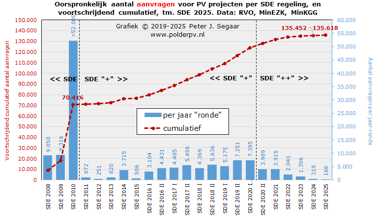 De accumulatie curve versnelt uiteraard in het "exceptionele" SDE jaar 2010 voor zonnestroom (dik 70 duizend aanvragen), en neemt sedertdien gestaag toe. Vanaf SDE "++" neemt het tempo merkbaar af, om voorlopig, met de 166 nieuwe aanvragen onder SDE 2025, uiteindelijk op bijna 135,6 duizend PV aanvragen, ooit ingediend onder alle SDE regelingen, te eindigen.