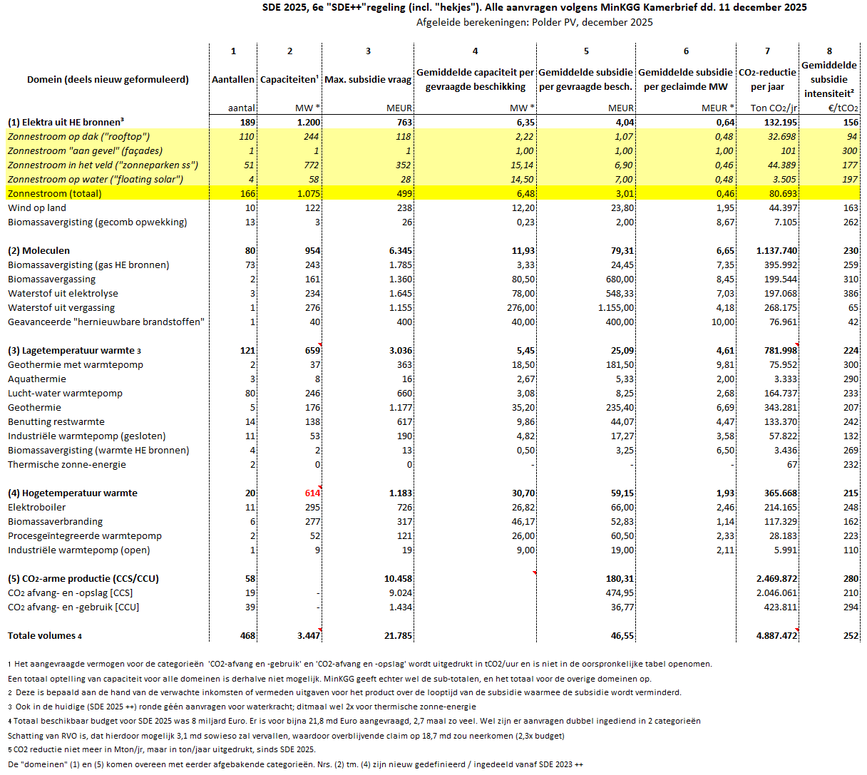 Hier onder presenteer ik wederom de data uit de door Min. KGG op 11 december 2025 gepubliceerde tabel voor SDE 2025, in de 4 pagina's tellende Kamerbrief van Sophie Hermans, aangevuld met een drietal kolommen uit deze data, berekend door Polder PV. De indeling heb ik vergelijkbaar gehouden aan die voor de tabel voor SDE 2024. Omdat er sedert de SDE 2023 5 "domeinen" worden onderscheiden die deels duidelijk verschillen met die van de indeling tm. SDE 2022, is de indeling gewijzigd. Alleen het 1e (elektra) en het 5e domein (CCS / CCU) zijn vergelijkbaar met de categorie indeling onder SDE 2022. De rest is, sinds SDE 2023, nieuw.
