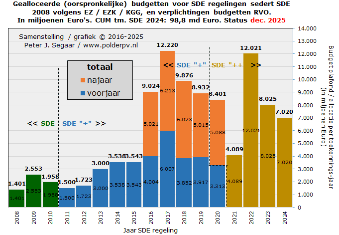 In totaal hebben álle SDE - SDE "++" regelingen tm. SDE 2024 een immens bedrag van 98,8 miljard Euro oorspronkelijk beschikt toegekend gekregen. Een zeer fors volume daarvan is echter in de loop der jaren alweer verloren gegaan, vanwege diverse redenen. Slechts een marginaal deel daarvan heeft met een of meer andere (nieuwe) beschikking(en) een vervolg gekregen.