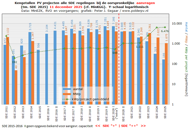 Ondanks de sterk toegenomen competitie met andere "CO2 reducerende" opties, en de continu afgenomen totaal volumes, blijft zonnestroom onder SDE "++" 2024 nog steeds een relatief populaire categorie. In totaal is er voor PV MEUR 499 aangevraagd (bijna op hetzelfde niveau als SDE 2024, met MEUR 501, maar meer dan halvering t.o.v. de 1,13 miljard Euro onder SDE 2023), met in totaal slechts 166 van de in totaal door RVO ontvangen 468 aanvragen (35%, onder SDE 2024 42%, onder SDE 2023 66%, en onder SDE 2022 nog 89%). En een gevraagde capaciteit van 1.075 MWp (SDE 2024 2.023 MWp, SDE 2023 3.361 MWp, SDE 2022 2.268 MWp). Er is dus 47% minder capaciteit aangevraagd dan onder SDE 2024, resp. 48% mínder aantallen PV projecten. Dit heeft wel geresulteerd in een veel hoger aangevraagd projectgemiddelde capaciteit. Tussen SDE 2020 II en SDE 2024 is dat gemiddelde omhoog gegaan van 1,05 MWp/project, via 2,6 MWp (SDE 2023), en 6,3 MWp (SDE 2024), naar alweer 6,5 MWp per project onder SDE 2025. Waarmee voor de zoveelste maal de verdere schaalvergroting van de afzonderlijke, aangevraagde projecten is gecontinueerd.