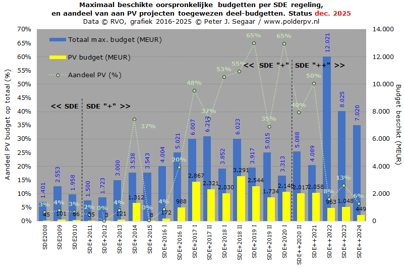 16 december 2025: Zesde SDE "++" ronde (najaar 2025). Budgetplafond weer extreem overschreden met factor 2,7; zonnestroom aanvragen verder neerwaarts, 166 exemplaren, 1.075 MWp, 47% lager dan in SDE 2024. De zesde SDE "++" subsidie ronde, de (enige) tranche van 2025, gestart op 7 oktober en, met beeindiging van fase 5 op 6 november 2025 gesloten, heeft het vorige record van bijna 16,3 miljard Euro voor SDE 2023, flink overtroffen. Er werd voor bijna 21,8 miljard Euro aan subsidie gevraagd (onder SDE 2024 was dat nog 10,5 miljard Euro), bij een beschikbaar budget plafond van maximaal 8,0 miljard Euro. Wederom blijken er "dubbele aanvragen" te zijn gedaan, waardoor er nog het een en ander vanwege die reden gaat wegvallen, en er mogelijk 18,7 miljard Euro over zou blijven, wat nog steeds 2,3 maal het budget plafond is. Er zal dus nog heel wat aan aanvragen moeten afvallen binnen de competitie, afgezien van aanvragen die om procedurele reden na inspectie door de ambtenaren van RVO sowieso afgekeurd zouden gaan worden.